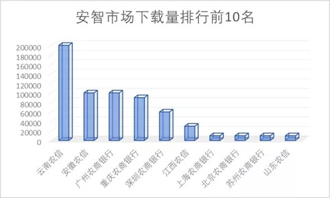 在安智市场中,云南农信的下载量达到20万次名列第一,安徽农信和广州农商银行以10万次下载量并列第二。15家农商银行在安智市场的下载量最低为10000次,另有5家银行在此应用商店没有投放APP。