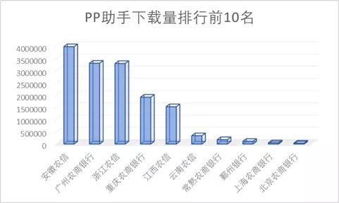 在PP助手中,安徽农信的下载量达到399万次名列第一,广州农商银行和浙江农信下载量分别为331万和330万紧随其后,15家农商银行在PP助手中的下载量最低为4万次,并且有5家银行的APP在该应用市场中未投放。
