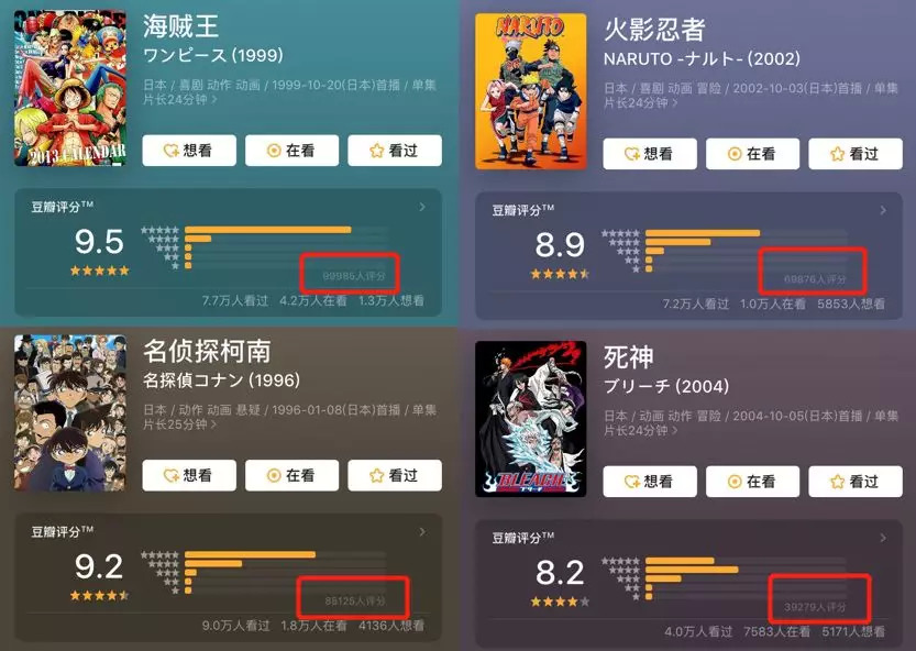 毒眸对几部热门动画在豆瓣上的评分人数进行统计后发现,《名侦探柯南》TV版动画共有8.5万人参与了评论,相较之下《火影忍者》不到7万人、《死神》不到4万人,在众多长期连载的大IP中仅次于《海贼王》的近10万人。虽然评论人数不能和受众基础直接划等号,但也侧面反映了《名侦探柯南》的火热。