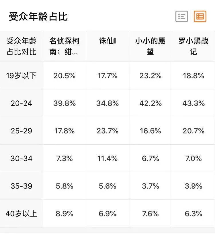 在豆瓣上,《名侦探柯南:通往天国的倒计时》等剧场版作品的评分人数都超过了8万,而《名侦探柯南:贝克街的亡灵》更是有超过11万评论人数,在诸多日本剧场版动画作品中名列前茅。对比同档期电影《小小的愿望》《诛仙Ⅰ》《罗小黑战记》后可以看到,此次《柯南2019》的受众中,30岁以上的观众占比仅次于拥有大量死忠书粉、同为大IP的《诛仙Ⅰ》,而40岁以上观众占比则是最高的,说明有不少关注《名侦探柯南》剧场版时间较长的观众愿意给影片买单。