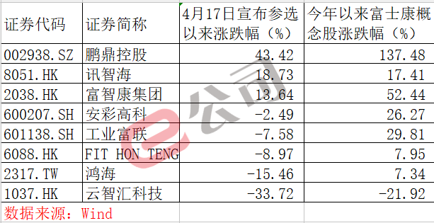 此外,富智康集团和工业富联今年以来累计涨幅分别达52%和30%。
