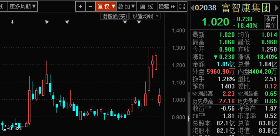 据媒体报道,台湾鸿海集团创办人郭台铭16日深夜宣布,决定不参与明年的台湾地区领导人选举。受消息影响,今日富士康概念股集体下挫,其中,富智康集团(02038.HK)开盘大跌21.6%,工业富联(601138)跌3%。截至中午收盘,富智康集团跌幅为18.40%,工业富联跌2.96%。