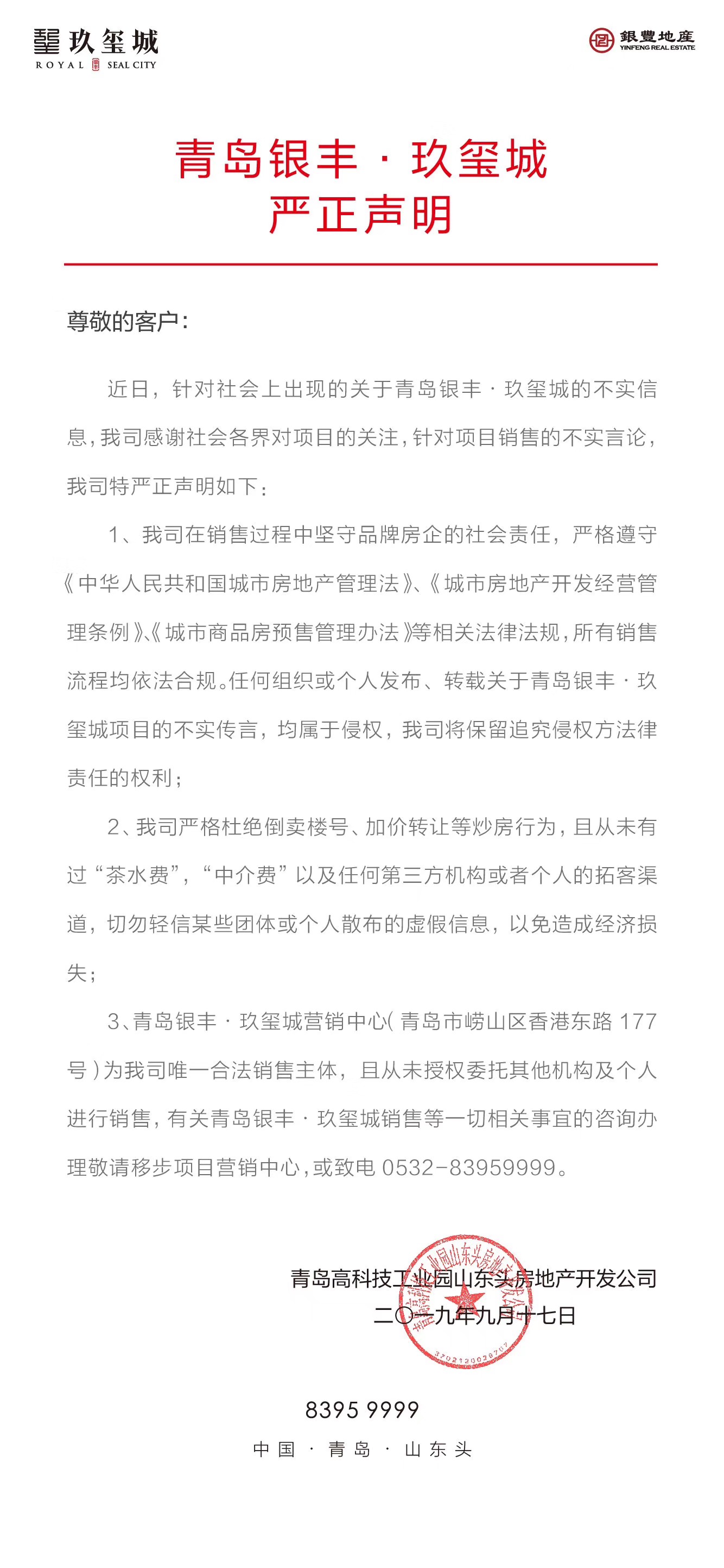 9月17日,青岛银丰玖玺城项目发布声明,就近日社会上出现的关于青岛银丰·玖玺城的部分信息和言论进行回应。声明中称:
