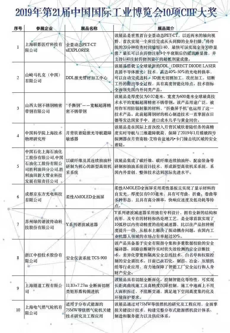 上海联影医疗科技有限公司的全景动态PET-CT uEXPLORER、山崎马扎克(中国)公司的DDL激光管材加工中心、山西太钢不锈钢精密带钢有限公司的“手撕钢”(宽幅超薄精密不锈带钢)等10家企业的展品分获大奖。