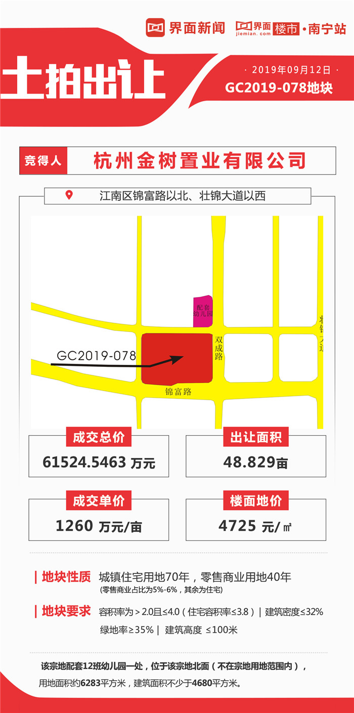 杭州金树置业有限公司以总价61524.5463万元,单价1260万元/亩,楼面价4725元/㎡摘得GC2019-078地块,因未达到最高报价1333万元/亩,因此该地块无须配建公租房。
