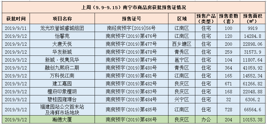 预售方面,上周南宁市商品房新增预售3115套,新增预售面积共计312435.54㎡。住宅方面,新增预售302282.16㎡,共计2911套;办公方面新增预售10153.38㎡,共计204套㎡。