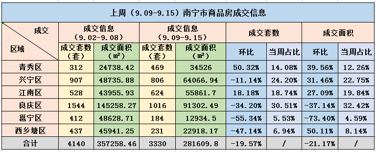 楼市进入“金九银十”,南宁楼市9月第二周市场短暂下行。上周南宁(9.9-9.15)商品房成交3330套,成交套数环比下降19.57%;成交面积共计357258.46㎡,成交面积环比下降21.17%。
