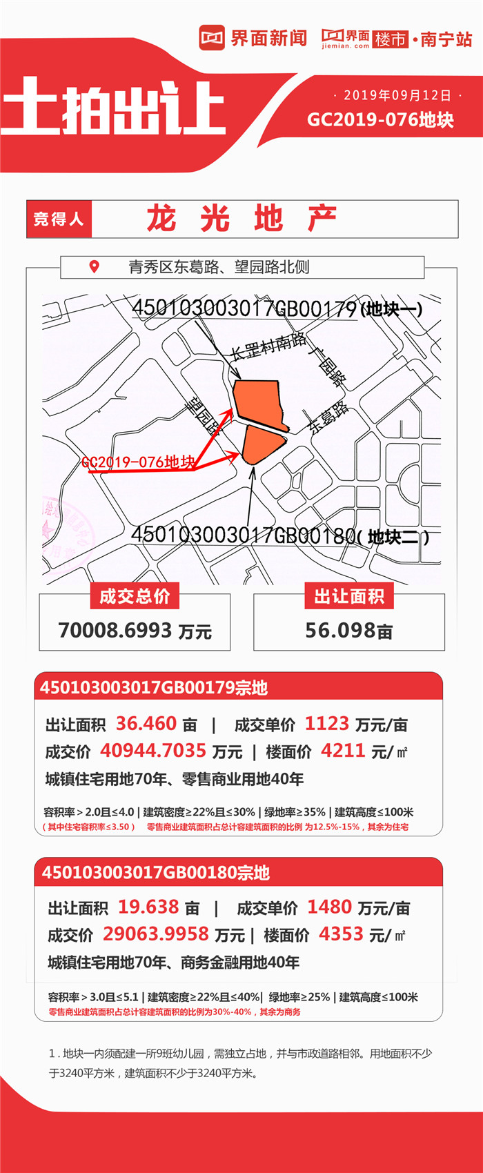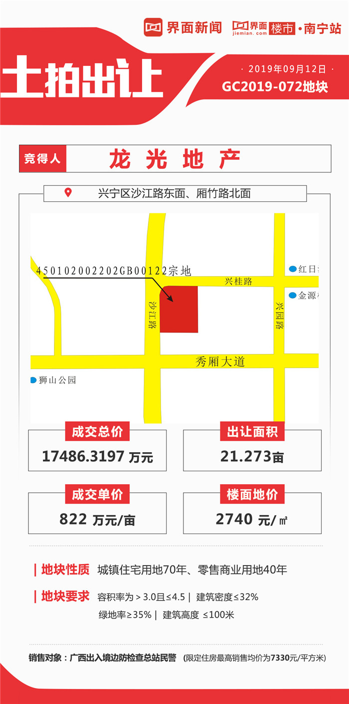 其中,龙光地产以单价822万元/亩,总价17486.3197万元 ,楼面地价2740元/㎡摘下位于兴宁区沙江路东面、厢竹路北面的GC2019-072地块;龙光地产以总价70008.6993万元,地块一单价1123万元/亩,成交价40944.7035万元,楼面价4211元/㎡;地块二单价1480万元/亩,成交价29063.9958万元,楼面价4353元/㎡摘得青秀区东葛路、望园路北侧GC2019-076地块。