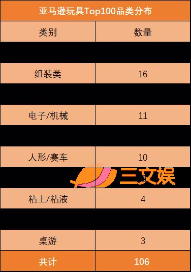 在去掉了一些不算玩具的东西之后,我们粗略的给剩下的106款玩具分了个类,情况如下表所示。