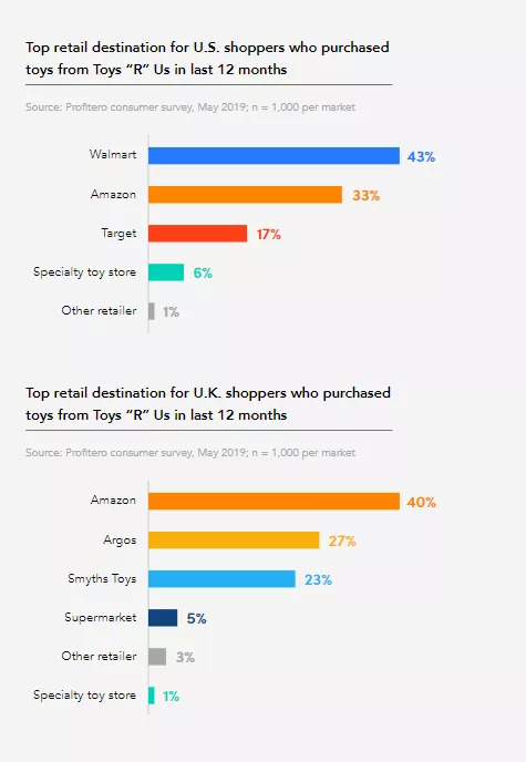 根据Profitero给出的数据,玩具反斗城倒闭后,有33%的美国人和40%的英国人在购买玩具时会首选亚马逊。