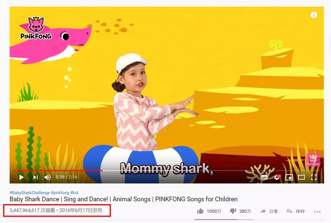 不过这并不是一首新歌,早在2016年它就被上传到了YouTube上。现在《Baby Shark》的累计播放量达到了34亿。我们在今年五月份写过一篇关于它的推文(儿歌视频是怎么变成一门生意的?),当时它的播放量还只有26亿--短短4个月,它又涨了8亿播放量。
