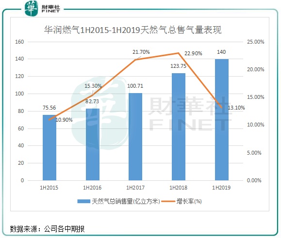 由于将精力集中在内涵式的主业发展,缺乏外延式并购带来的增量,华润燃气2017年上半年之后的售气量增长速度有所放缓,尤其是2019年上半年总售气量增速放缓至13.1%,工业、商业及民用售气量增速均出现不同程度的下滑。