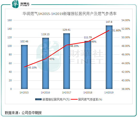 近年来,华润燃气居民接驳业务数目于大中城市用气人口规模的扩大而快速增长,在2015年-2019年,每年上半年的新增接驳居民用户均超过100万。经营区域内居民燃气渗透率也由2015年上半年的43.1%提升至2019年上半年的51.6%。