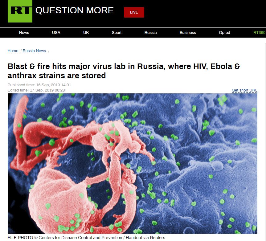 当地时间周一(9月16日),俄罗斯柯尔兹沃市(Koltsovo)一生物研究中心因气体桶爆炸引发火灾。该研究中心是全球仅有的两个储存天花病毒的地点之一,同时还存有埃博拉、艾滋、炭疽等活体病毒。