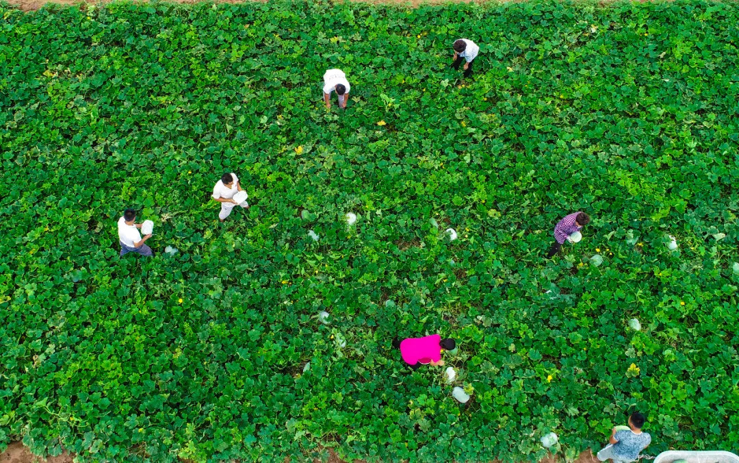 2019年7月7日,河北故城县建国镇姜圈村蔬菜基地,种植户在采摘冬瓜。(新华社记者李晓果 摄)
