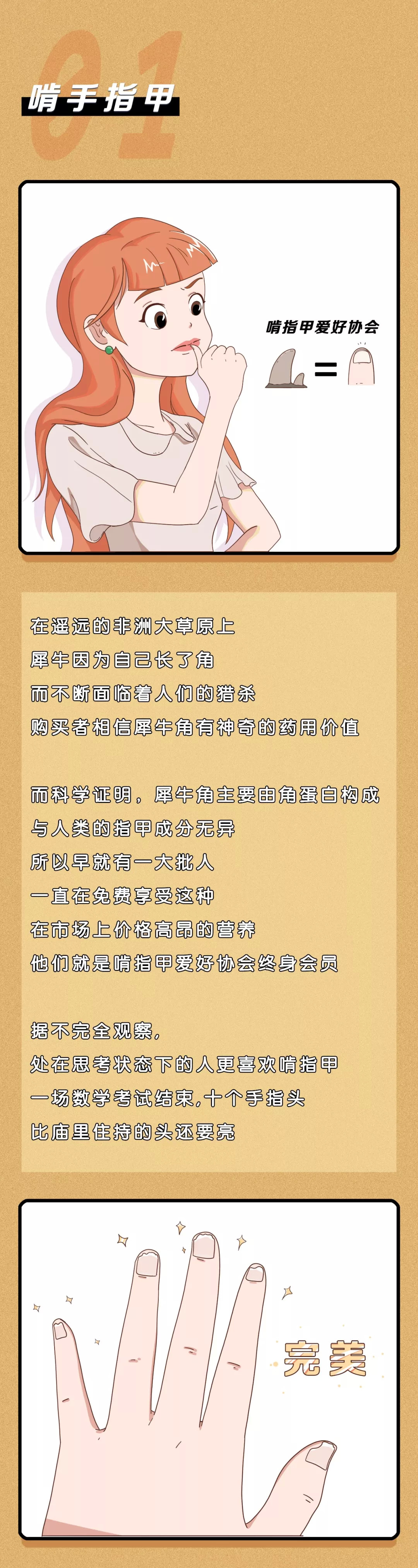自从小学三年级我第一次咬了手指甲后,那一声美妙的脆响在我脑海中始终挥之不去。到如今的二十几年里,在脑子还没有意识到的时候,手指甲已经被放在了上下牙之间,那看起来索然无味的,坚硬的手指甲,却在我的牙齿与舌尖上盘旋了无数次,就像一颗颗没有被炒制过的原味瓜子仁,一旦开始嗑,就再也停不下来了。这二十年间,因为啃手指甲,我承受着爸妈的威胁与呵斥,忍受着无法做美甲的痛苦,面对着同学和朋友的无情嘲笑,但是很显然,我的手早已经不听大脑的指令了。即使我心里无比希望自己能有美丽饱满的指甲,但也无法放弃啃指甲那一刻获得的爽感。
