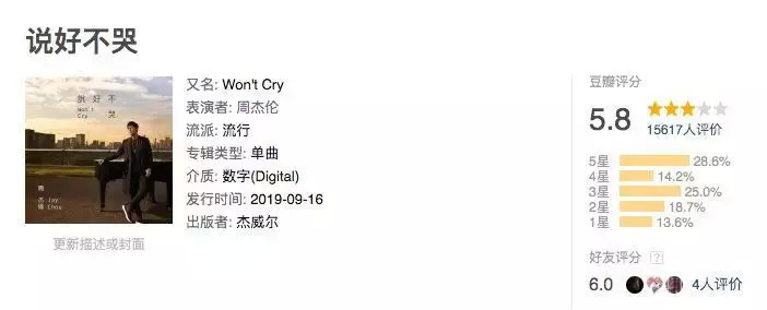 目前《说好不哭》的豆瓣评分仅为5.8分,较巅峰时期的《范特西》的9.2分差距巨大。不少人认为周杰伦已经“周郎才尽”,写不出好歌,只能卖情怀了。