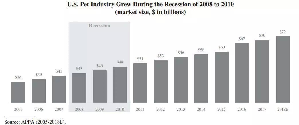 美国宠物用品协会的调查证明,宠物消费受经济周期的影响很小,即便在2008-2010年经济衰退期间,美国的整体消费支出下降,但美国的宠物消费增长了12%。