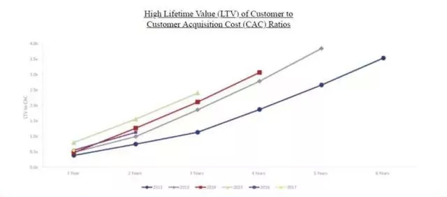 由上图可以看出,公司各个客户群的LTV/CAC比率都在逐年提高。