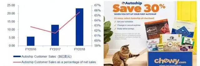 订阅式购买服务Autoship解决了Chewy的获客成本难题。招股书显示,Autoship服务贡献了2018财年65.7%的营收。