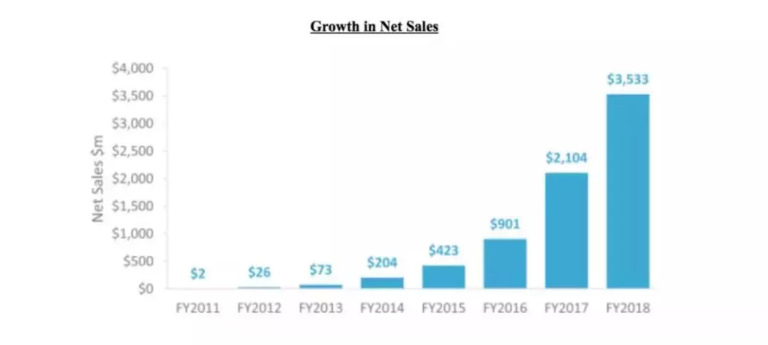 2019年6月14日Chewy登陆纽交所,招股书显示,2014财年公司营收2.04亿美元,2015财年翻番增至4.23亿美元,2016财年再翻番至9.01亿美元,2017财年为21.04亿美元,2018财年达到35.33亿美元。