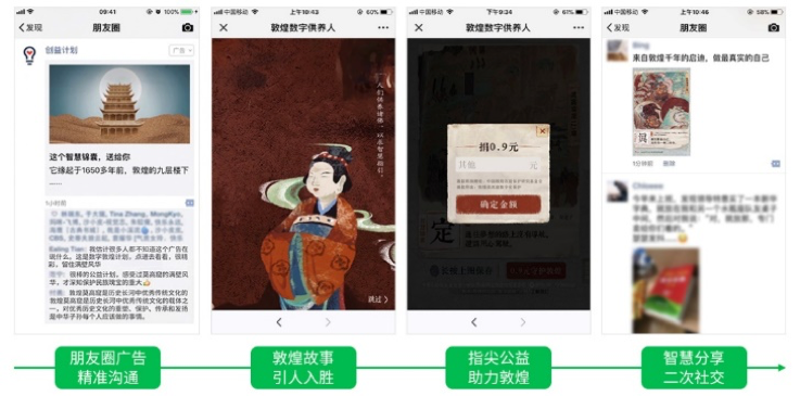 微信广告一次又一次地通过创新的传播方式,让公益的价值达到最大化。譬如腾讯“数字供养人计划”曾经关注过敦煌洞窟之中的壁画修复——要知道,普通人是很难亲身参与到这样的活动之中。