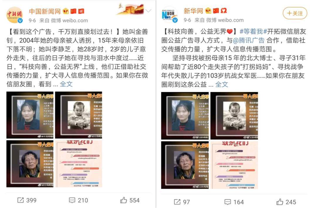 “看到这个广告,千万别直接划过去!”中国新闻网发布了这样一条微博,指的是近期由央视《等着我》栏目发布的一条颇受关注的微信朋友圈广告。这支广告以全景迷宫的方式发布“寻人”任务,成功吸引了网友关注广告中的三个真实寻亲故事。新华网、光明日报和新闻晨报等媒体都在其官方微博发布了相关消息,甚至称之为“最温暖的朋友圈”广告。