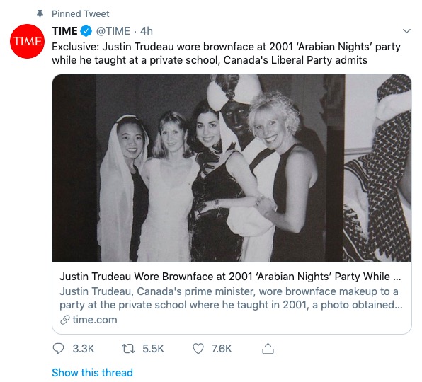 周三(9月18日),美国《时代》杂志在推特上独家发布了一张照片,照片里的特鲁多将脸部涂成深棕色,穿着阿拉伯服饰,头上还戴着穆斯林男性常戴的长头巾(turban)。《时代》杂志在配文中称,照片摄于2001年的一个“阿拉伯之夜”派对,时年29岁的特鲁多正在一所私立学校任教,加拿大自由党已承认照片中确为特鲁多。