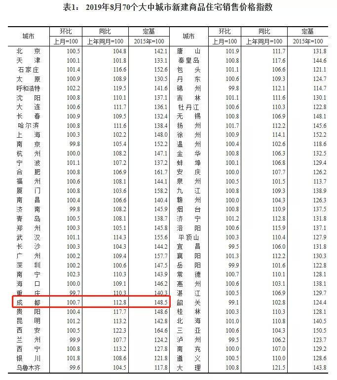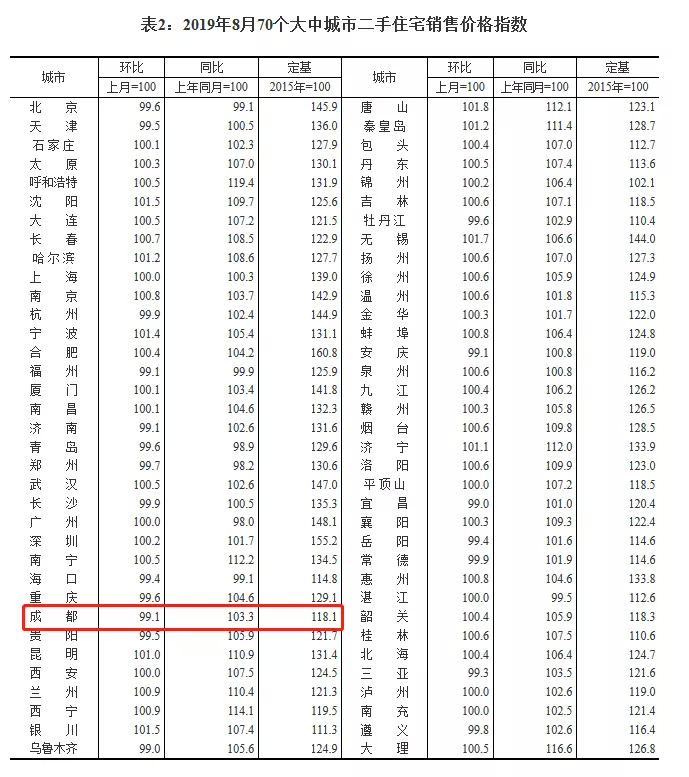 前几天,国家统计局在其官网发布了《2019年8月份70个大中城市商品住宅销售价格变动情况》。其中,8月份成都二手房价格指数环比下跌0.9%,跌幅排名全国第三,仅次于宜昌和乌鲁木齐(两座城市的跌幅均为1%),也创下了成都近三年来的单月最大跌幅。