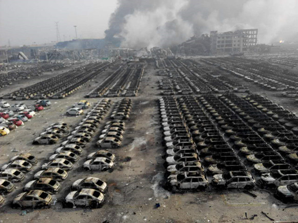 距离集装箱200米左右的停车场,上千辆轿车被烧毁成骷髅状,汽车金属骨架、轮轴甚至被融化。现场生活物品四散,被爆炸飞出的化学品损毁的面目全非。