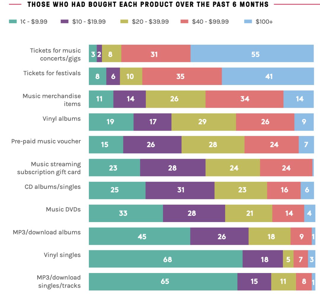 由上图可见,在购买音乐相关产品的人群中,40-99.99美元消费区间占比为34%,20-39.99美元消费区间占比为26%,100美元以上的占比为14%。可以看到,市场对于音乐周边的付费意愿强烈,且具备一定规模,对于音乐人和音乐公司来说至关重要。