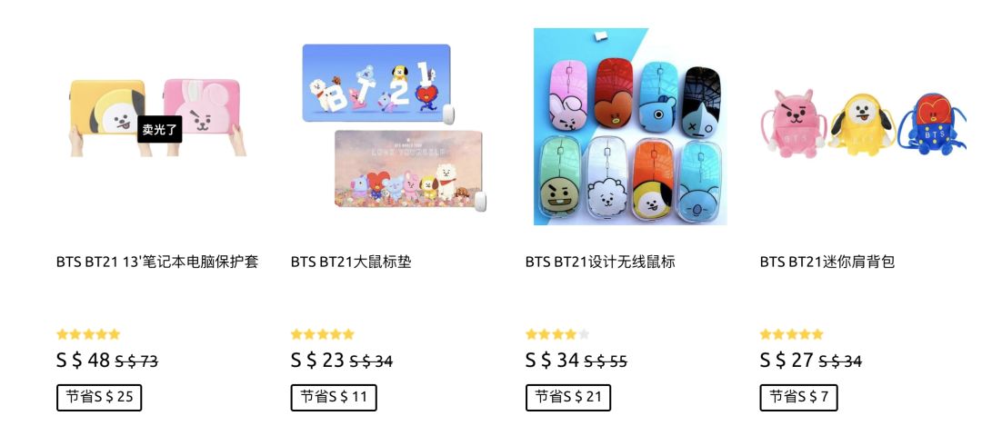 毫不夸张的说,如果你想,BTS的日常售卖产品完全可以涵盖生活的每一个角落,从床上四件套到应援灯的灯套,应有尽有。而这些周边产品,大部分与BT21相关联。BT21是LINE FRIEND联手防弹少年团推出的8个卡通形象。BT21的产生大大增加了周边产品开发的可能性。