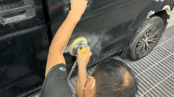 所以除掉原来炸裂的车漆和厚厚的腻子成了我们开工的主旋律,还要附带将车身生锈的部位除锈。从动图上我们就能看出,车漆下面厚厚一层腻子,这是为了避免再花钱钣金,将省钱省到了极致,正如前文所说,这种漆面修复手段是不可取的,因为过厚的腻子在后期很容易造成漆面龟裂,而且腻子无论是老化还是遇水都会变形,造成漆面不平,十分难看。
