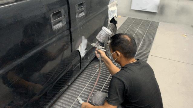 检查了一下,腻子已经干透了,我们就开始进行下一步,也是最后一步,喷漆。如果说钣金是技术活,那喷漆就是个细心的活了。想把车漆喷好,可是需要点耐心才行。先上底漆,再上色漆,最后上清漆,喷漆过程中还要仔细的观察漆面状况。如果在喷底漆的时候发现漆面有针孔或者细微的划痕还要用幼滑腻子进行修补。整车喷漆从开始到结束至少要7~10天。