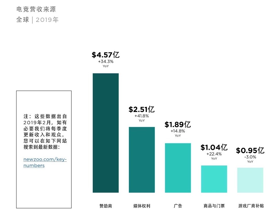 根据Newzoo和ECO氪体联合发布的《全球电子竞技市场报告》中显示,2019年电竞营收将首次攻破10亿美元大关,其中占比最高的收入来源是赞助收入。