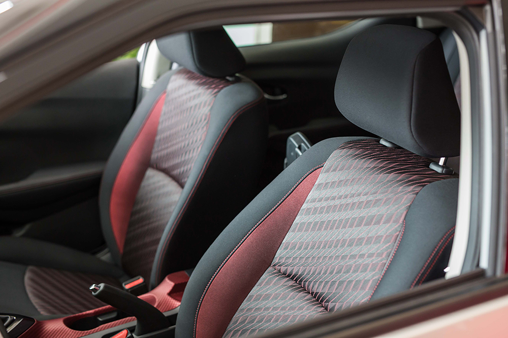 我们要专门说一下新蓝鸟的内饰材质,图片上的红色材质非常特别,甚至在其他车型上很少见到。这种特别并不是说材质成本高——其实它就是硬塑料,上面的纹路很接近碳纤维的视觉效果,但是它的特别在于触感,这种类似于编织的纹路有浮起的凸点,手感是磨砂和光滑触感交织,触摸上去很有质感。据说,这种面板是新蓝鸟设计团队专门开发的,也是基于年轻人的审美需求而设计的。