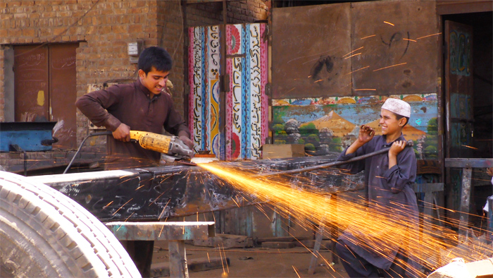 在白沙瓦东南部的一个大篷车工厂里,囤积着不少年代久远的进口二手卡车。一名司机正在催促工人们抓紧改装一辆1965年的英国进口卡车,说他赶着上路做生意。