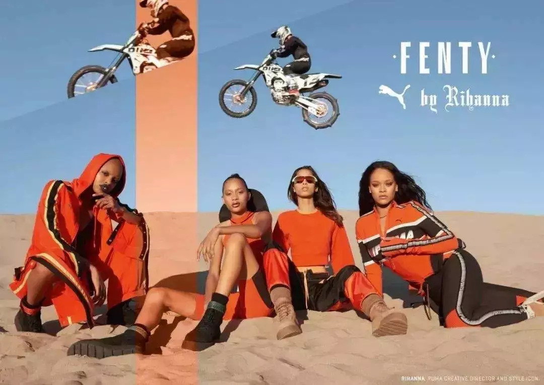在2014年,PUMA用七位数的价格签下了美国当红歌手Rihanna,邀请其作为Fenty系列的创意总监为品牌注入一些新鲜的血液。当时,Nike和Adidas在运动品牌领域可以说二分天下,而PUMA在两大巨头的倾轧下一直表现平平。