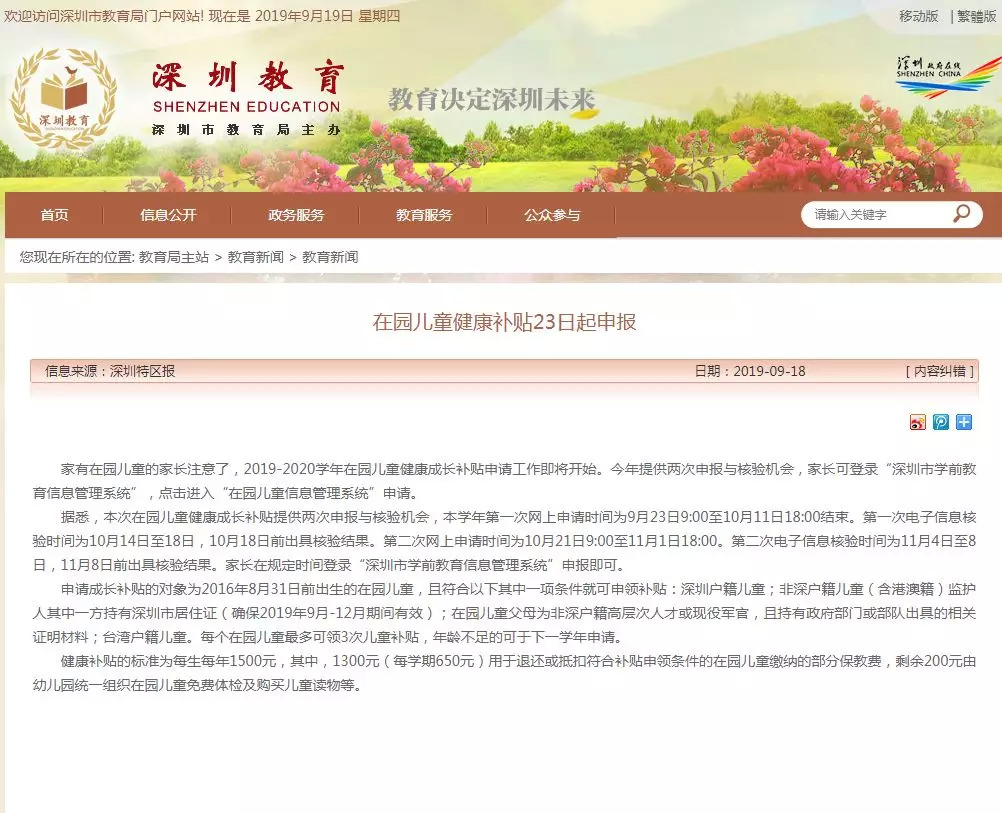 2019-2020学年深圳市在园儿童健康成长补贴将陆续开放申请,家长可登录"深圳市学前教育信息管理系统"进行申报。