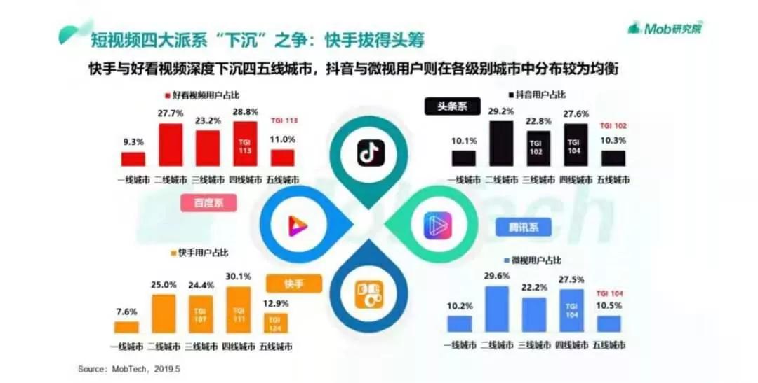 平台方面,短视频应用整体下沉明显,短视频四大派系中,快手拔得头筹,在二、三、四线城市的用户分布比较平衡。