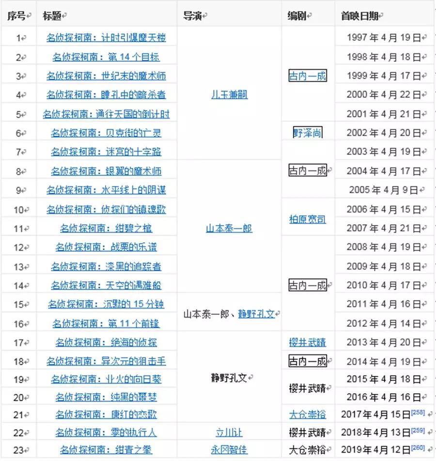 从以下公布的剧场版历年的创作团队的数据中,我们可以看到有些元老级的主创已经离世,从某种程度来说,虽然柯南还在日复一日的读着小学,但还原最初原汁原味的柯南也许早已变成一种不切实际的奢望。