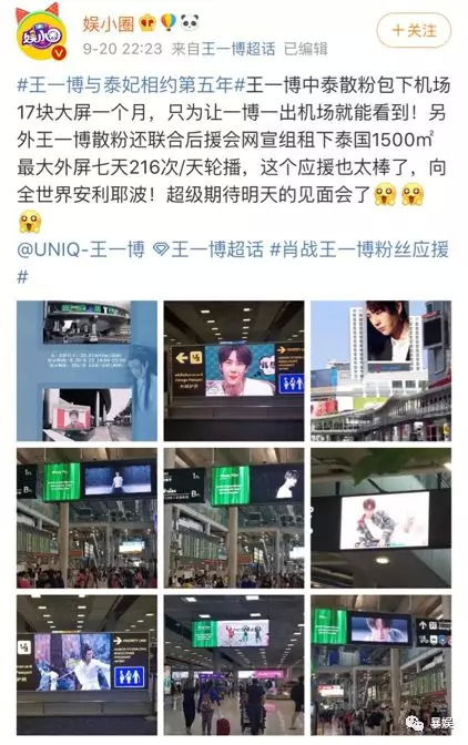王一博的中泰散粉们包下了机场的17块大屏,还有粉丝合力租下了泰国1500平方米的最大外屏,每天轮播216次,长达七天,绝对是真爱了。
