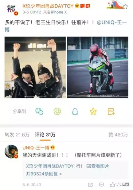 很快,王一博在微博下方回复,并吐槽摩托车的照片要更新了。随后战哥用表情包回复并爽快答应。