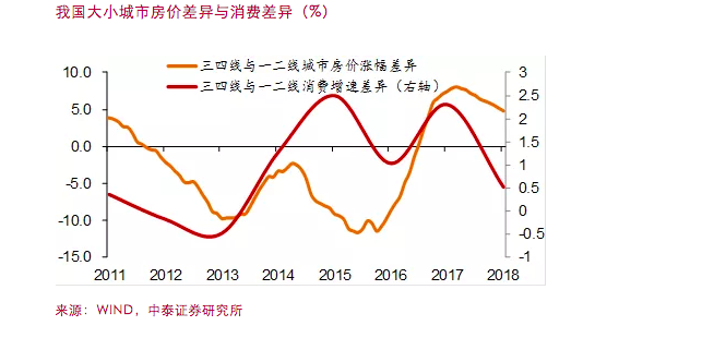 我们的研究表明,房地产繁荣对消费的拉动作用还是比较明显的,因为房价上涨能带来“财富幻觉”,购房之后对家具、家装、家电的需求增加。因此,房价表现好的城市,消费也表现好;房价差的城市消费也较差。