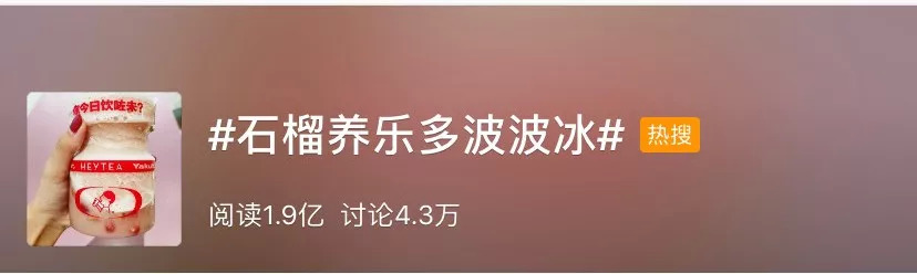 从喜茶官微统计,微博话题“喜茶×养乐多”阅读量接近1200万,讨论3万条,话题“石榴养乐多波波冰”阅读量甚至高达1.9亿。