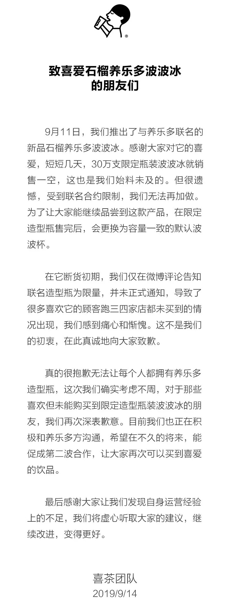 喜茶微博发布的致歉函,图片来自@喜茶
