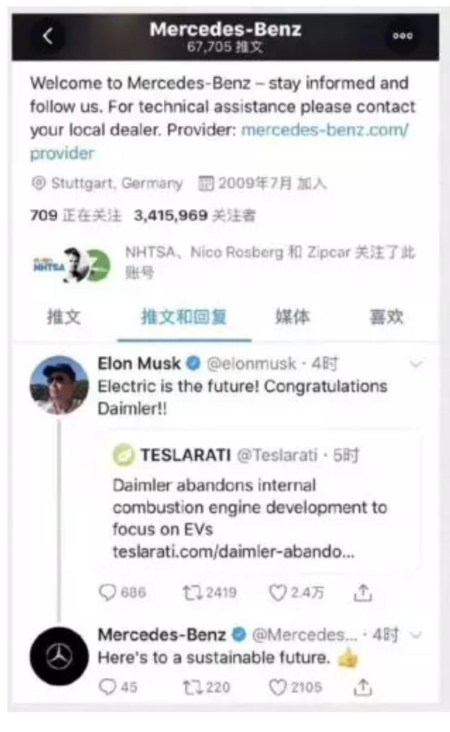 相信戴姆勒和奔驰放弃传统燃油车的,拿特斯拉创始人马斯克Twitter上的“恭喜戴姆勒!电动车才是未来!!”作证。