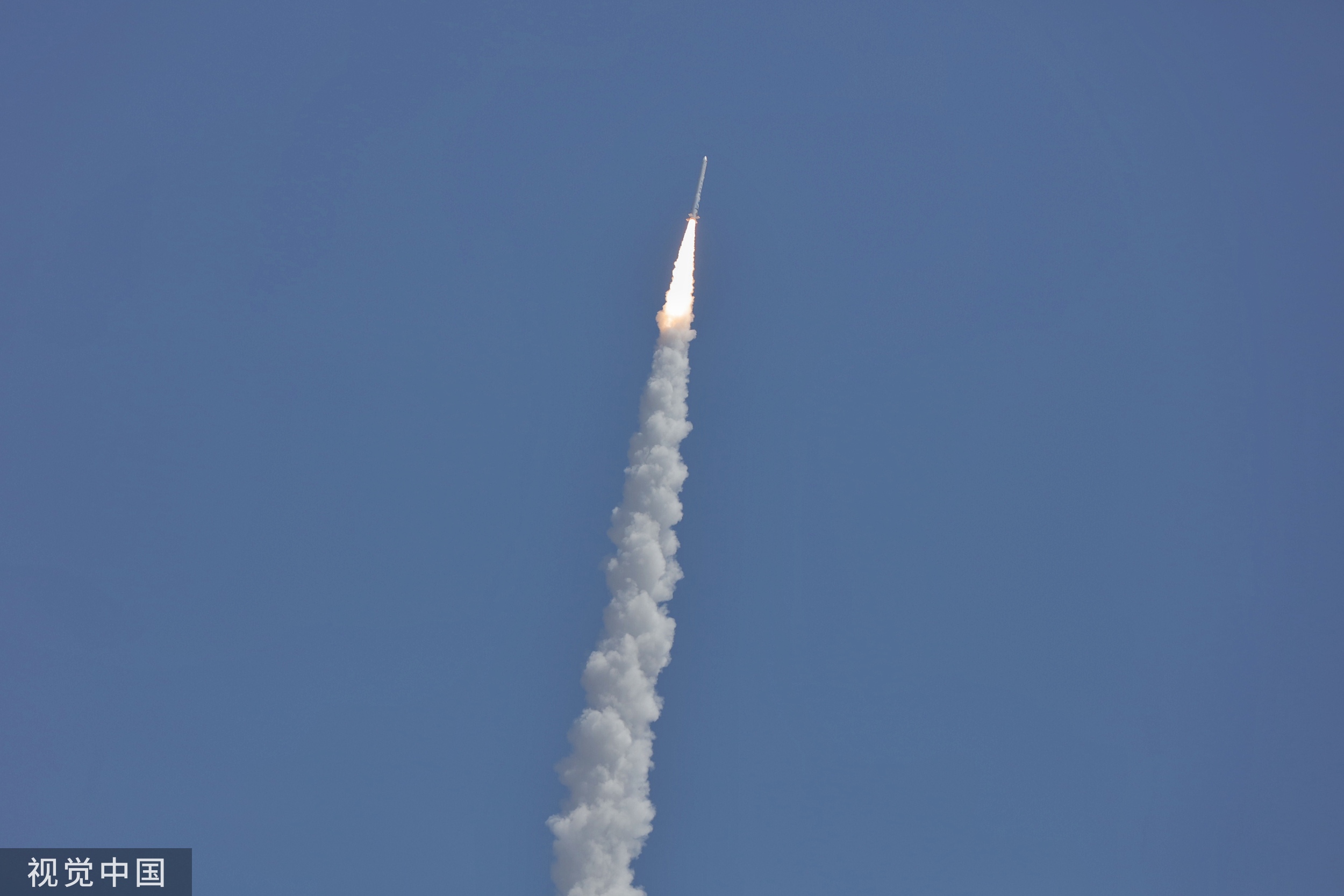 这枚火箭由民营火箭公司星际荣耀设计研发,名为双曲线一号。中午13时00分,火箭正式点火发射,底部瞬间燃起巨大的火球,火箭腾空而起,在天空中划出一道白色轨迹。