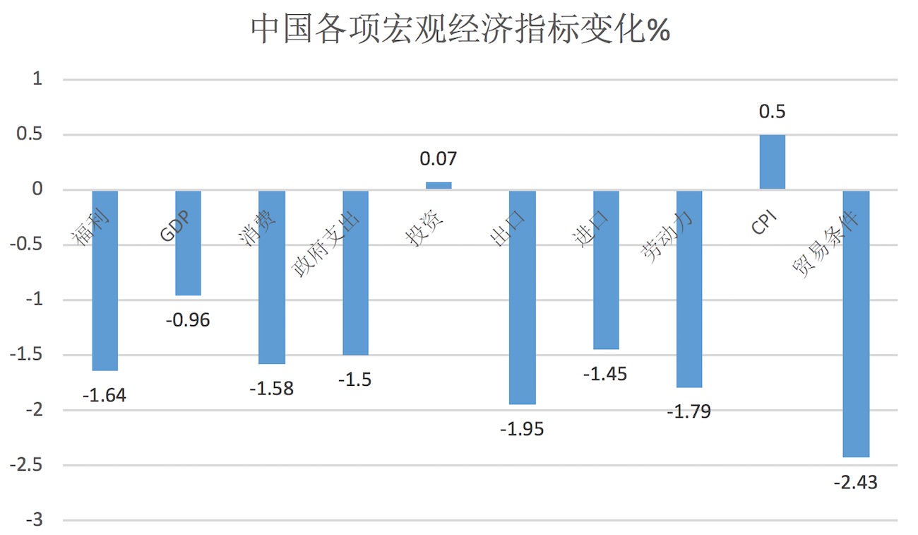 沙特原油供应减半将对中国宏观经济各项指标产生负面效应,在现实中再加上中美贸易战的影响,中国经济下行风险加剧。除GDP小幅下降外,消费、政府支出、劳动力就业都将经历不同程度的下跌。 受原油贸易下降影响,中国进口、出口将分别下跌1.45%、1.95% ,贸易条件也相应恶化。原油供应减少导致油价上涨,从而将带来生活、生产资料成本上升,带动消费者物价指数上涨0.5%,但我国实行的成品油价格管制将有效控制油价涨幅,通胀水平仍属可控范围。