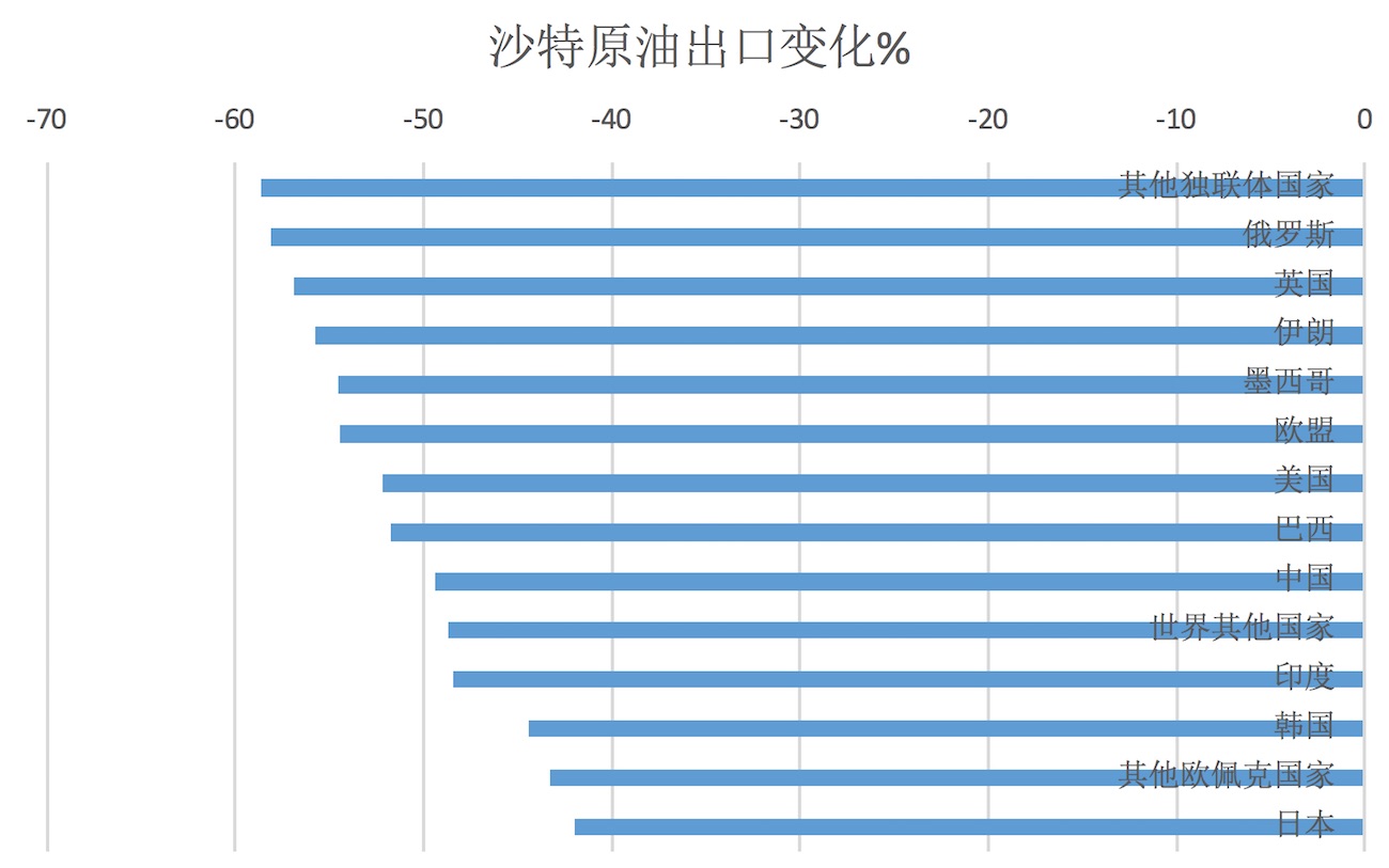 在沙特产量减产40%的情景设置下,全球主要产油国家的产量将会经历小幅上涨,其中中国、美国分别上涨1.18%、1% (图4)。沙特原油减产将严重影响沙特原油出口,沙特对世界主要经济体的原油出口量将相应下跌超过50% (图5)。